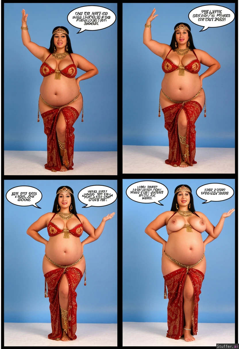 pregnant belly dancer, belly inflation comics sequence huge belly growth, belly hanging, high quality print art by Jim lee