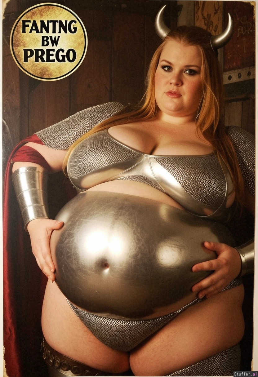 Viking saudi preggo bbw fantasy epic METAL poster wearing tight armor, shining, vintage huge belly, massive cleavage