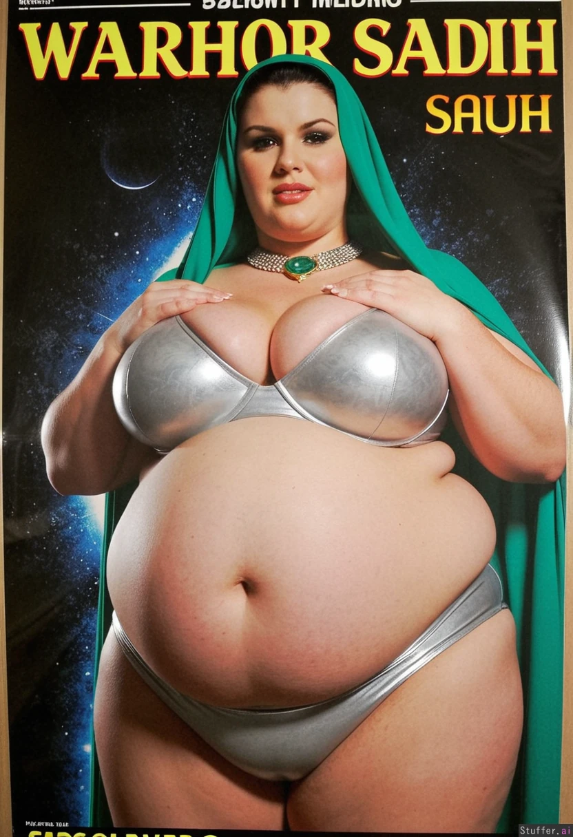Warrior saudi preggo bbw fantasy epic METAL poster wearing tight cloth, shining, vintage huge belly, massive cleavage