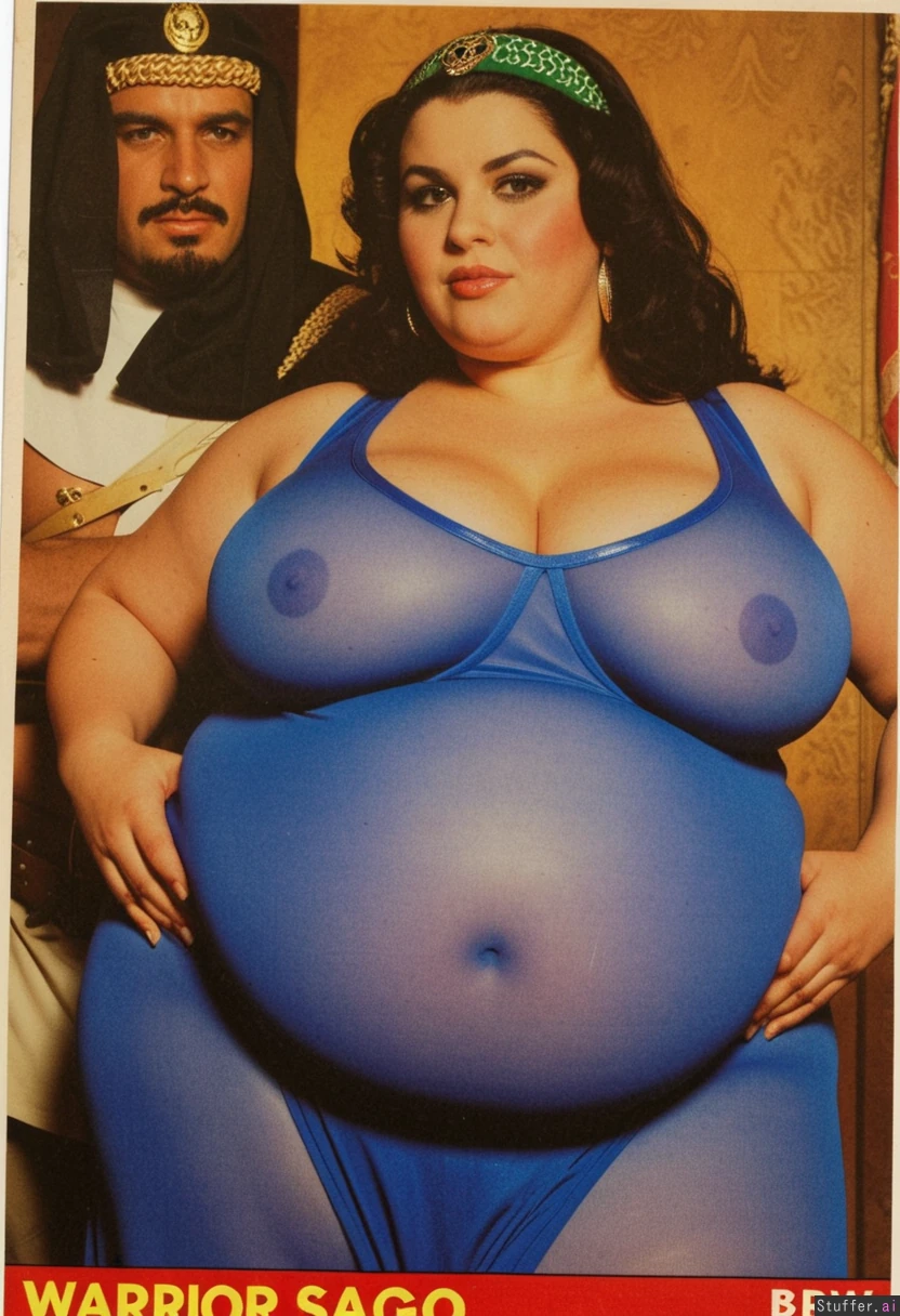 Warrior saudi preggo bbw fantasy epic poster wearing tight cloth, shining, vintage huge belly, massive cleavage