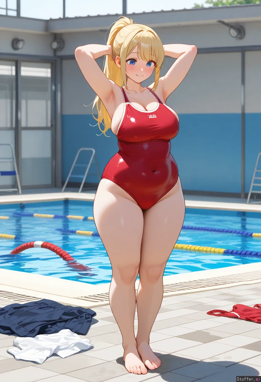 high quality, detailed, 1girl, blonde hair, mature body, long hair, blue eyes, blushing, full body view, medium natural breasts, slightly chubby, narrow waist, full hips, standing, smiling, ponytail, looking_down, red one-piece_swimsuit, hands_behind_head, pool, undersized_clothes, discarded_clothing, side_view,