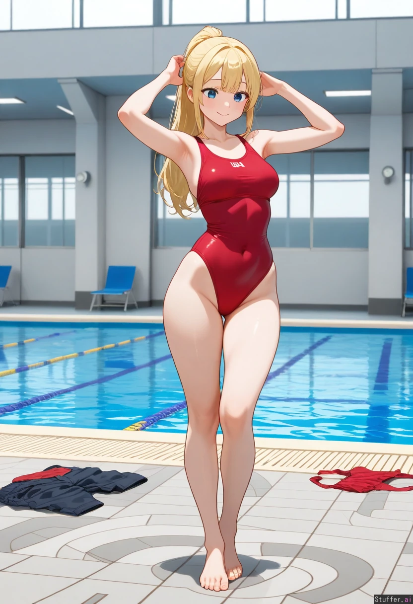 high quality, detailed, 1girl, blonde hair, mature body, long hair, blue eyes, detailed beautiful face, full body view, medium natural breasts, fit, narrow waist, full hips, standing, smiling, cute pose, ponytail, looking_down, red one-piece_swimsuit, pool, undersized_clothes, discarded_clothing,