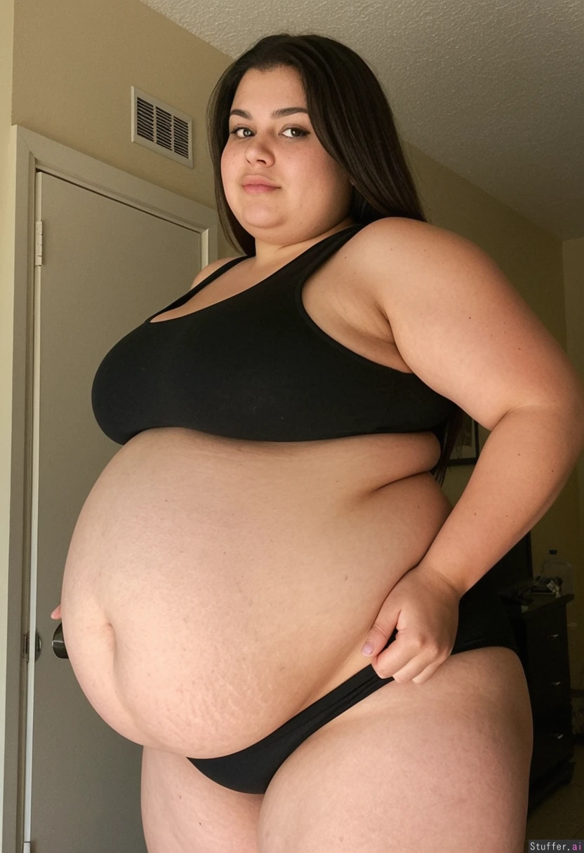 Fat Latina in a tight black tank top and black underwear and a huge belly and a really fat face massive thighs and side boob lots of cellulite