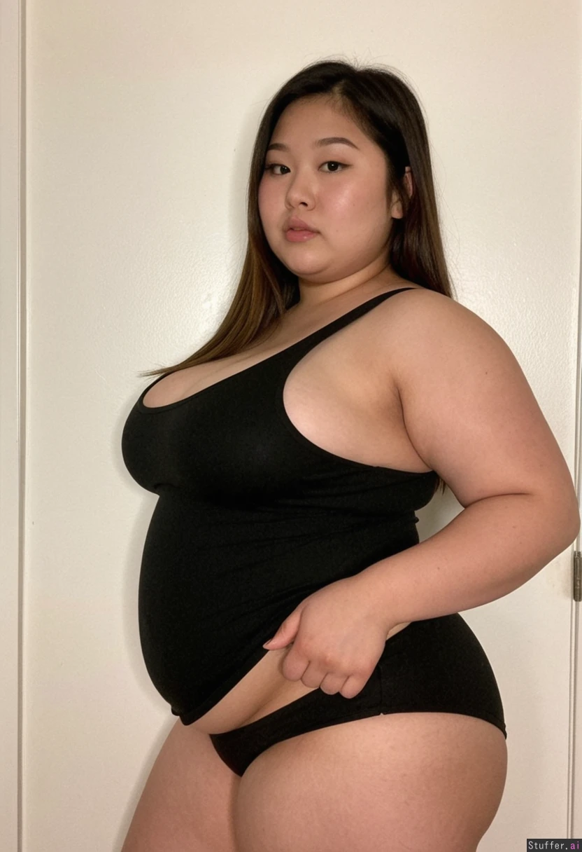 Chubby Asian girl with black tank top and black underwear huge thighs and side boob