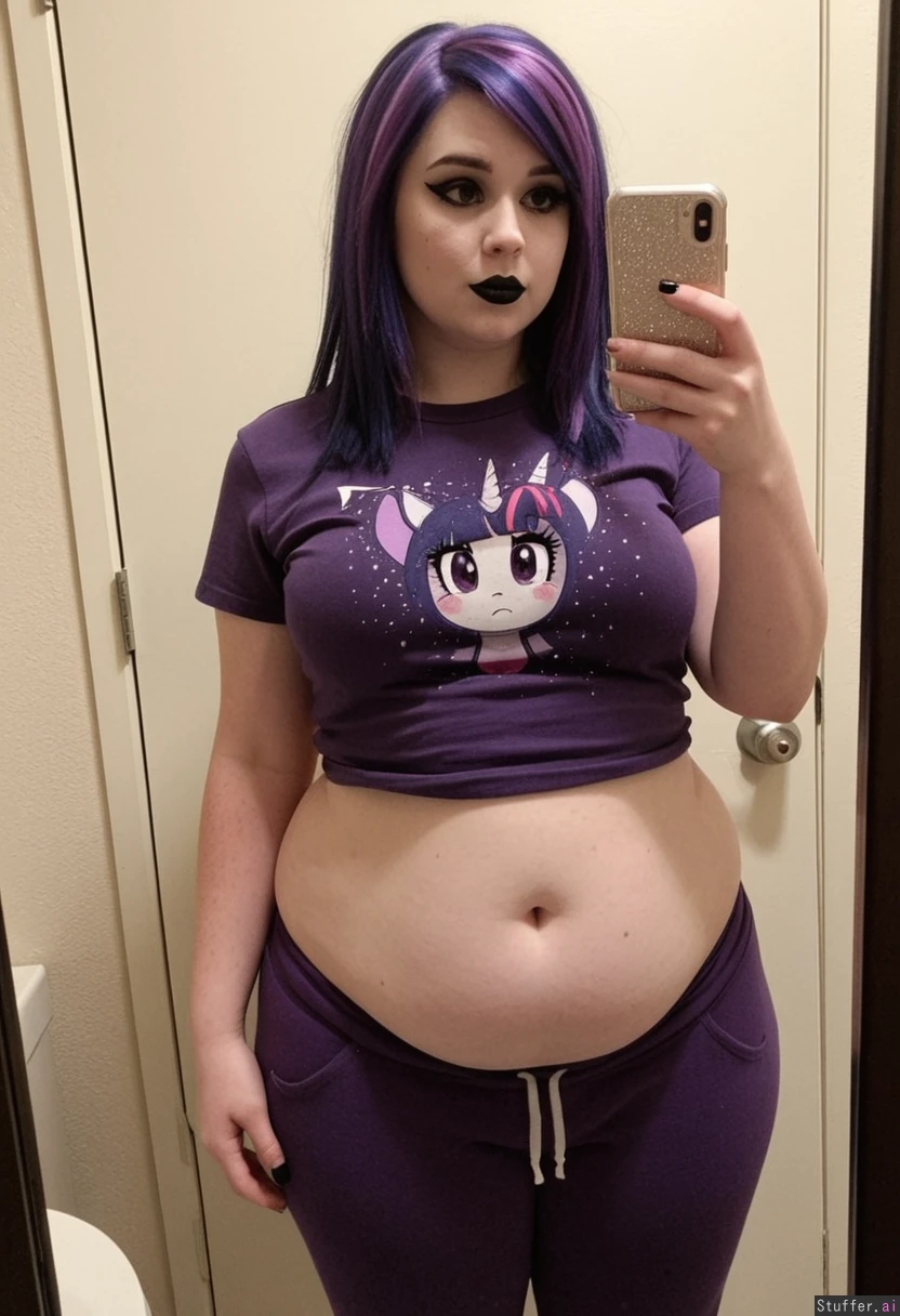 Character:((Twilight Sparkle)) Extremely beautiful young white girl (wearing t-shirt and pants) (((Wide hips))) Plump Fat_belly Taking selfie in restroom Dark makeup, (thin face), (skinny face), black lipstick, Pointy nipples Emo hairstyle
