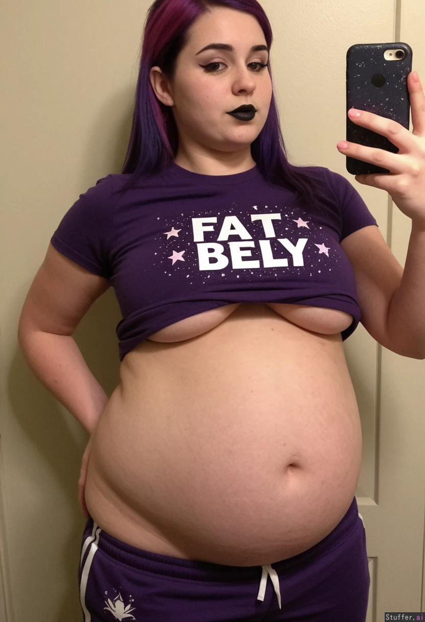 Character:((Twilight Sparkle)) Extremely beautiful young white girl (wearing t-shirt and pants) (((Wide hips))) Plump (Fat_belly:1.9) Taking selfie in restroom Dark makeup, (thin face), (skinny face), black lipstick, Pointy nipples Emo hairstyle