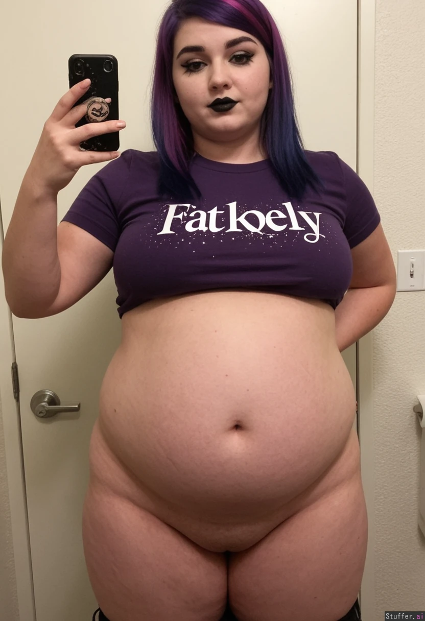Character:((Twilight Sparkle)) Extremely beautiful young white girl (wearing t-shirt and pants) (((Wide hips))) Plump (Fat_belly:1.9) Taking selfie in restroom Dark makeup, (thin face), (skinny face), black lipstick, Pointy nipples Emo hairstyle