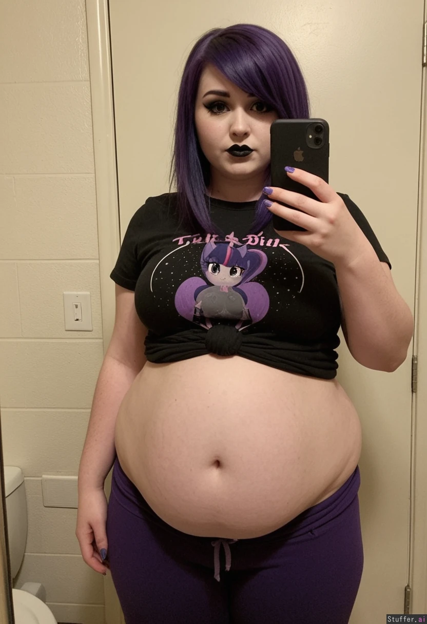Character:((Twilight Sparkle)) Extremely beautiful young white girl (wearing t-shirt and pants) (((Wide hips))) Plump (Fat_belly:1.2) ((Belly hang)) Taking selfie in restroom Dark makeup, (thin face), (skinny face), black lipstick, Pointy nipples Emo hairstyle