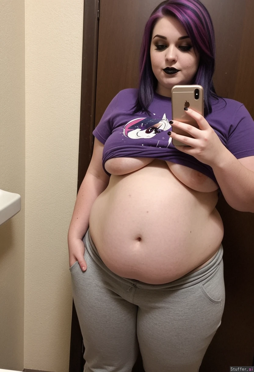 Character:((Twilight Sparkle)) Extremely beautiful young white girl (wearing t-shirt and pants) (((Wide hips))) Plump (Fat_belly:1.2) ((Belly hang)) Taking selfie in restroom Dark makeup, (thin face), (skinny face), black lipstick, Pointy nipples Emo hairstyle Pale clear skin Grabbing her belly fat