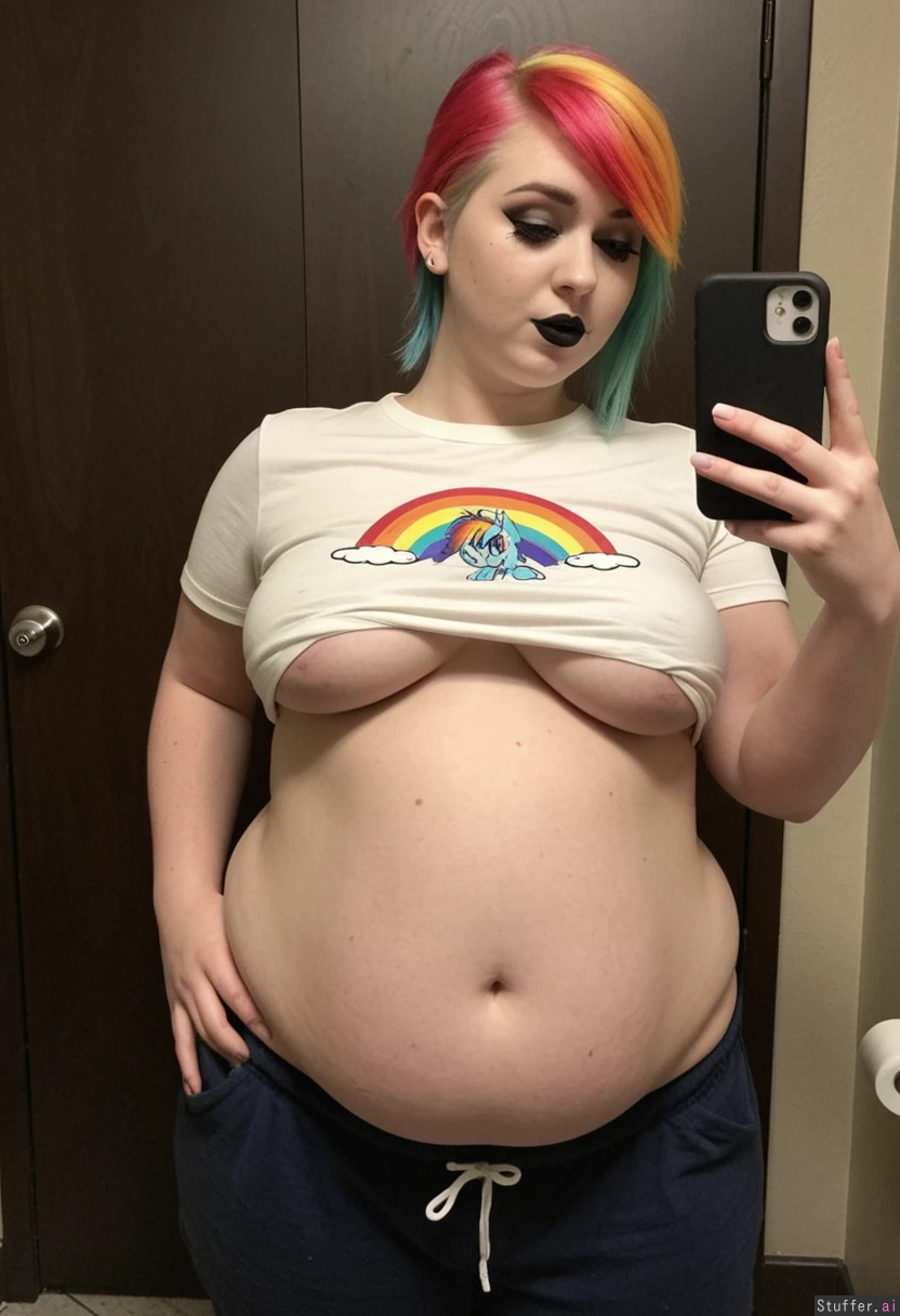 Character:((Rainbow Dash)) Extremely beautiful young white girl (wearing t-shirt and pants) (((Wide hips))) Plump (Fat_belly:1.2) ((Belly hang)) Taking selfie in restroom Dark makeup, (thin face), (skinny face), black lipstick, Pointy nipples Emo hairstyle Pale clear skin Grabbing her belly fat