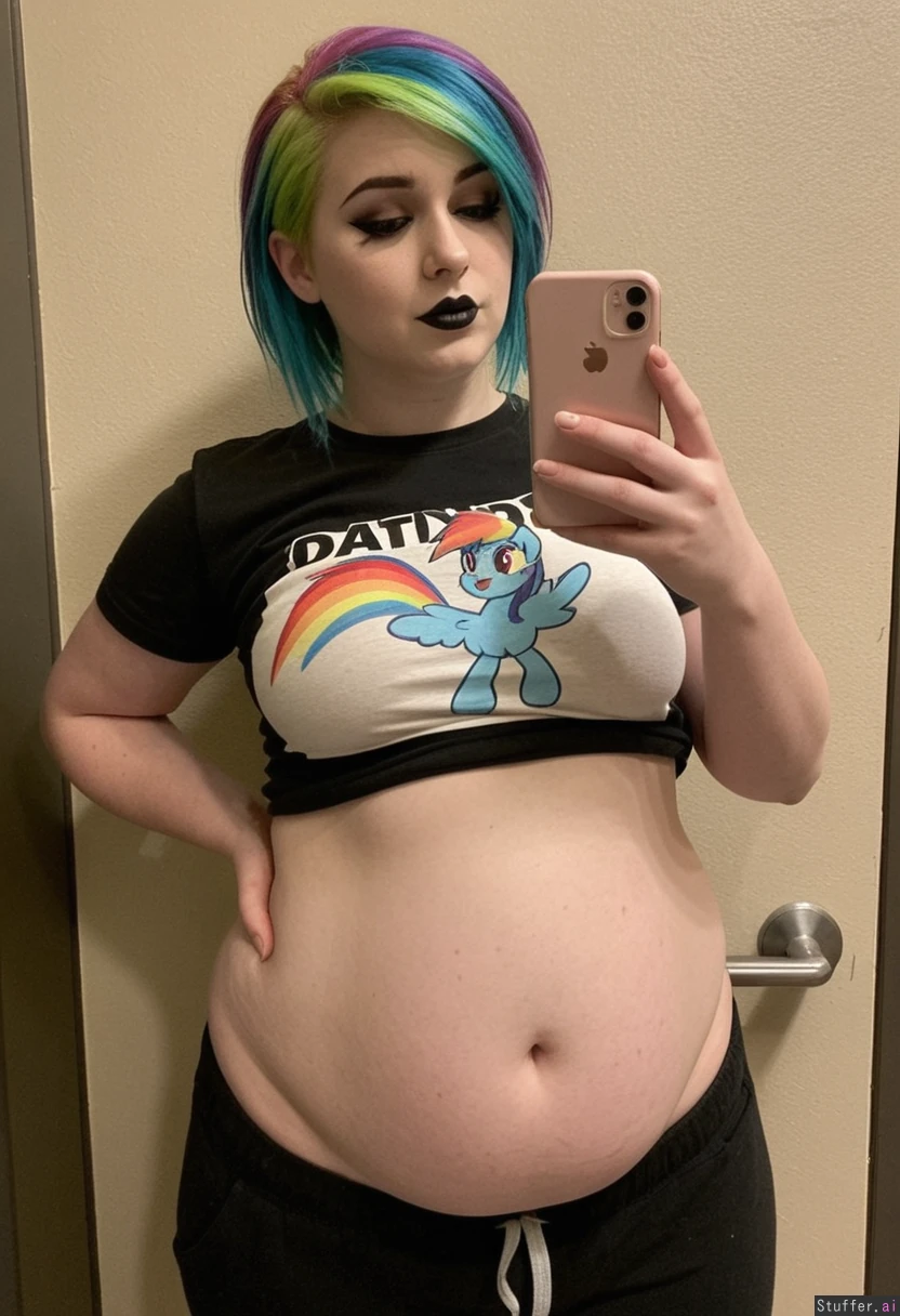 Character:((Rainbow Dash)) Extremely beautiful young white girl (wearing t-shirt and pants) (((Wide hips))) Plump (Fat_belly:1.2) ((Belly hang)) Taking selfie in restroom Dark makeup, (thin face), (skinny face), black lipstick, Pointy nipples Emo hairstyle Pale clear skin Grabbing her belly fat