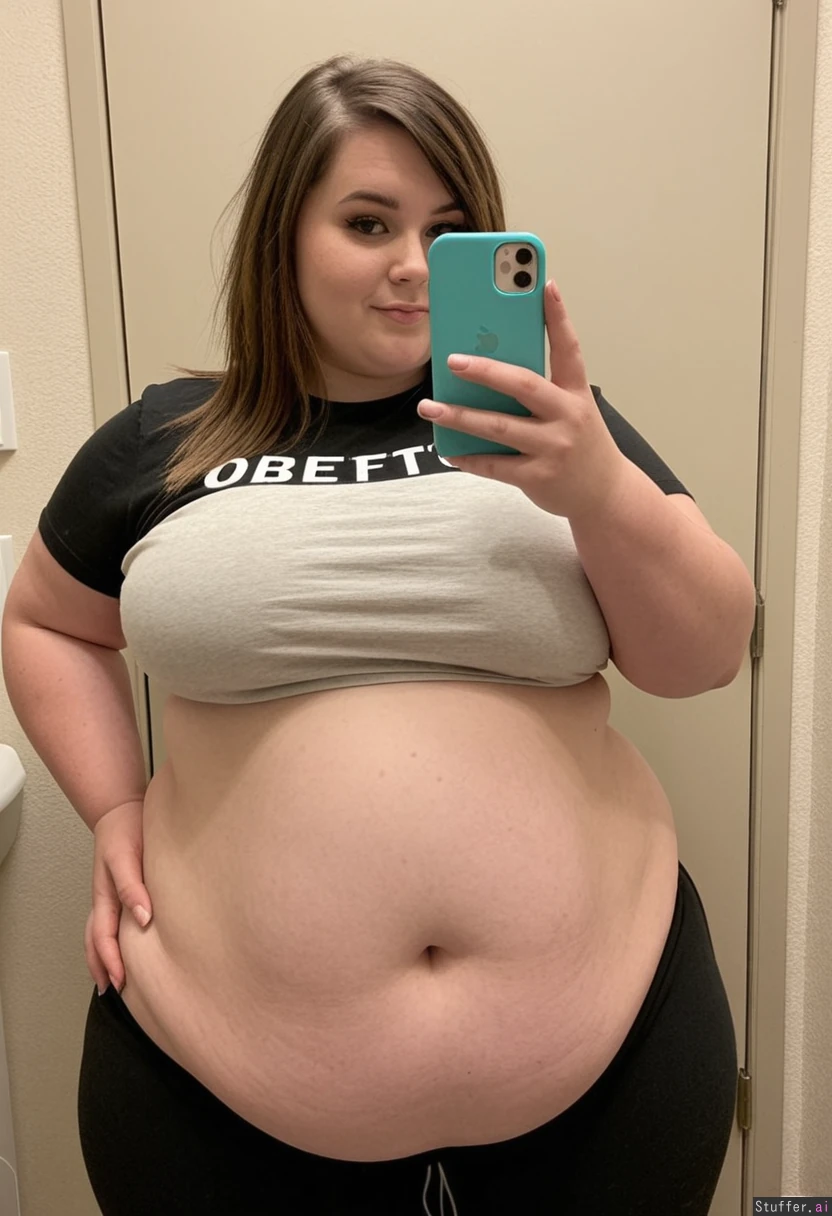 Extremely beautiful young emo girl (wearing t-shirt and pants) (((Wide hips))) Obese Overweight Plump Fat_belly Taking selfie in restroom