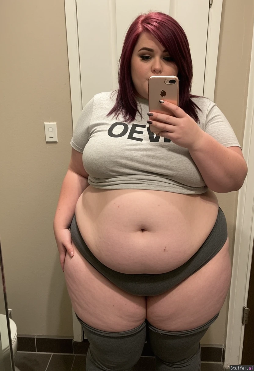 Extremely beautiful young emo girl (wearing t-shirt and pants) (((Wide hips))) Obese Overweight Plump Fat_belly Taking selfie in restroom