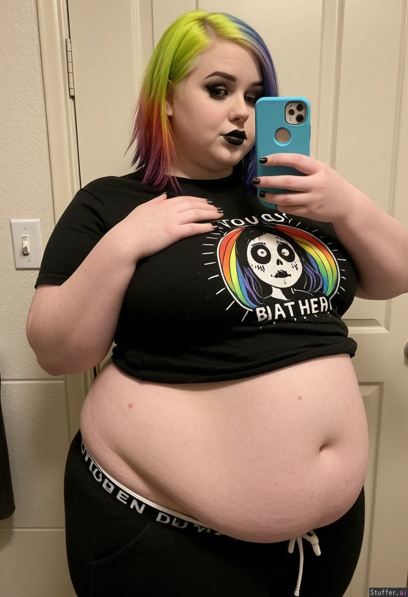 Extremely beautiful young emo girl (wearing t-shirt and pants) Beautiful pale skin, thin face, rainbow emo hair, dark eyeshadow, dark lipstick Shaking her fat belly (((Wide hips))) Obese Overweight Plump Fat_belly Taking selfie in restroom