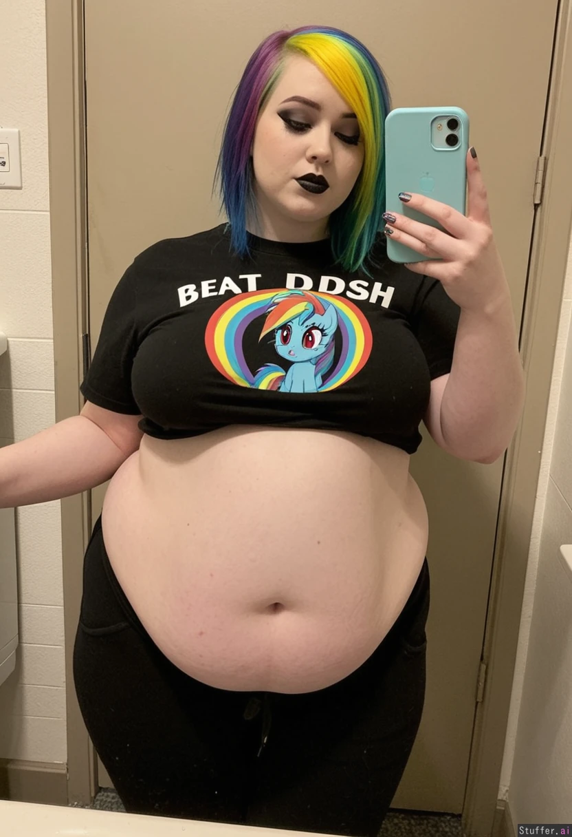 Extremely beautiful young emo girl (wearing t-shirt and pants) Beautiful pale skin, thin face, rainbow emo hair, dark eyeshadow, dark lipstick, lustful, wanting more (Rainbow dash) Shaking her fat belly (((Wide hips))) Obese Overweight Plump Fat_belly Taking selfie in restroom