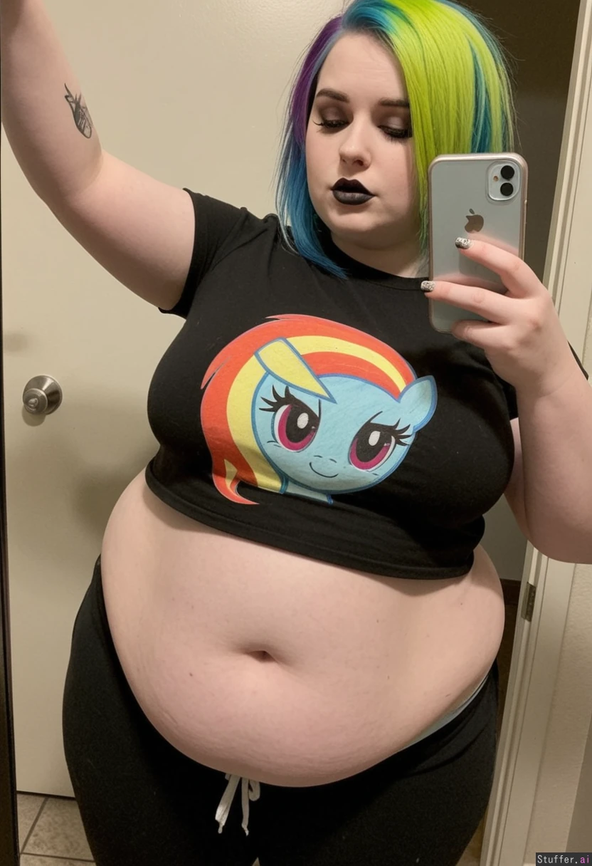 Extremely beautiful young emo girl (wearing t-shirt and pants) Beautiful pale skin, thin face, rainbow emo hair, dark eyeshadow, dark lipstick, lustful, wanting more, seductive look (Rainbow dash) Shaking her fat belly (((Wide hips))) Obese Overweight Plump Fat_belly Taking selfie in restroom