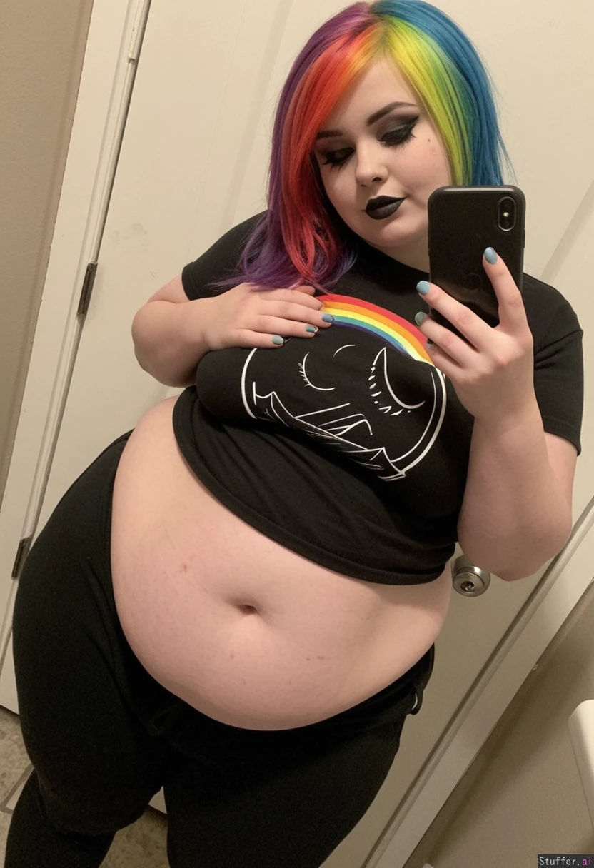 Extremely beautiful young emo girl (wearing t-shirt and pants) Beautiful pale skin, thin face, rainbow emo hair, dark eyeshadow, dark lipstick, lustful, wanting more, seductive look (Rainbow dash) Shaking her fat belly (((Wide hips))) Obese Overweight Plump Fat_belly Taking selfie in restroom