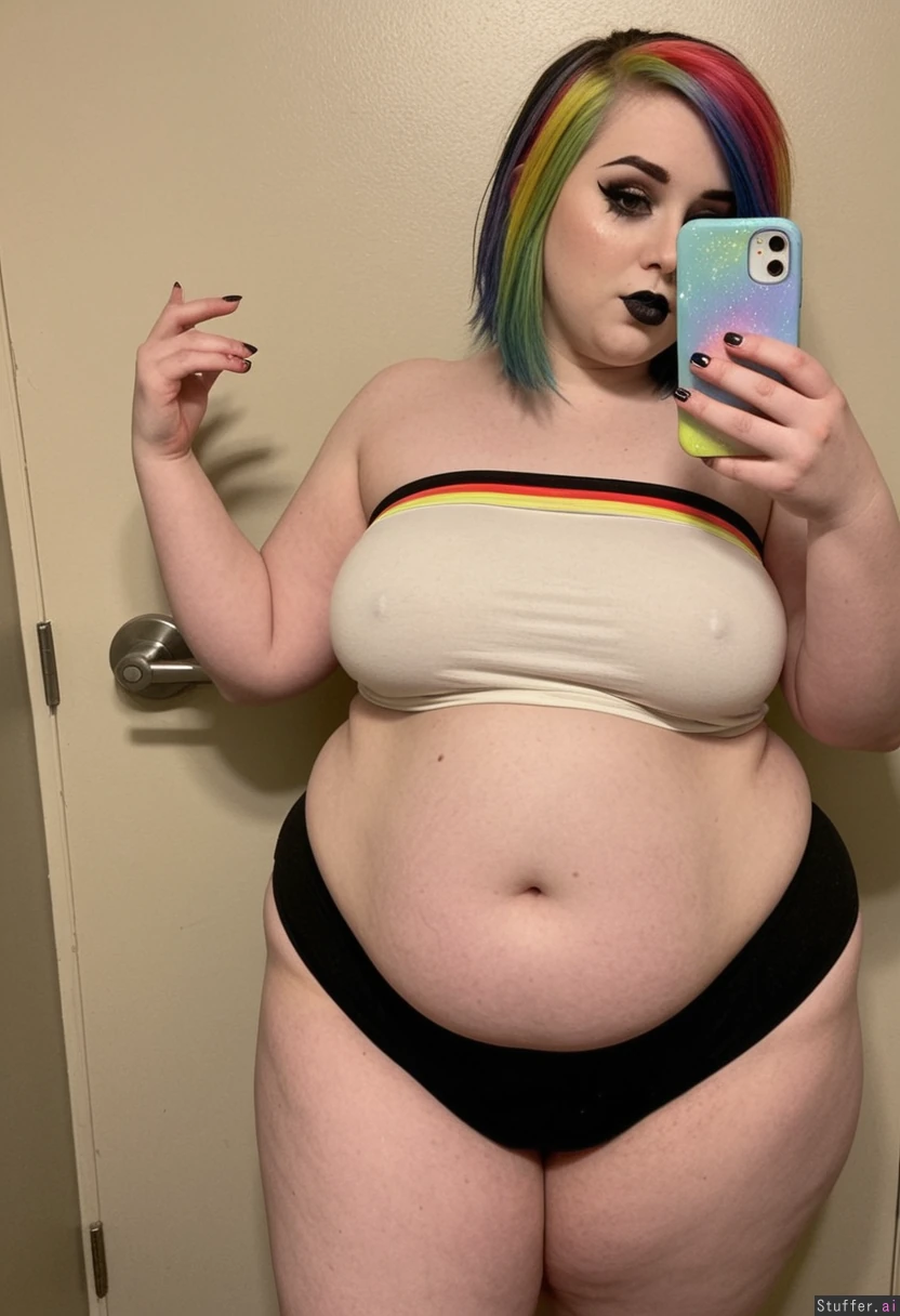 Extremely beautiful young emo girl (wearing tube top and shorts) Beautiful pale skin, thin face, rainbow emo hair, dark eyeshadow, dark lipstick, lustful, wanting more, seductive look, huge breasts (Rainbow dash) Shaking her fat belly (((Wide hips))) Obese Overweight Plump Fat_belly Taking selfie in restroom