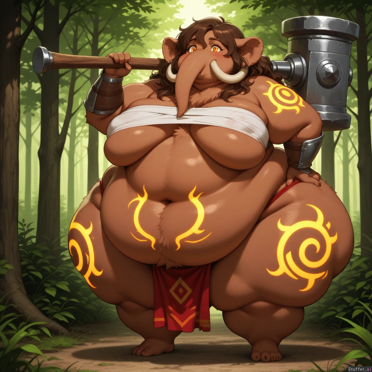 high_rating, female, solo, anthro, furry, mammoth, furry_body, brown_hair, wavy_hair, brown_fur, long_hair, orange_eyes, (morbidly_obese:1.3), fat_thighs, fat_legs, fat_arms, sagging_belly, sagging_breasts, wide_hips, hyper_ass, hyper_belly, hyper_thighs, standing, barefoot, double_chin, chubby_cheeks, (neck fat), fat_rolls, forest, glowing_tattoos, red_loincloth, chest_tuft, (fluffy:1.3), bandaged_chest, brown_belly, oversized hammer, vambraces