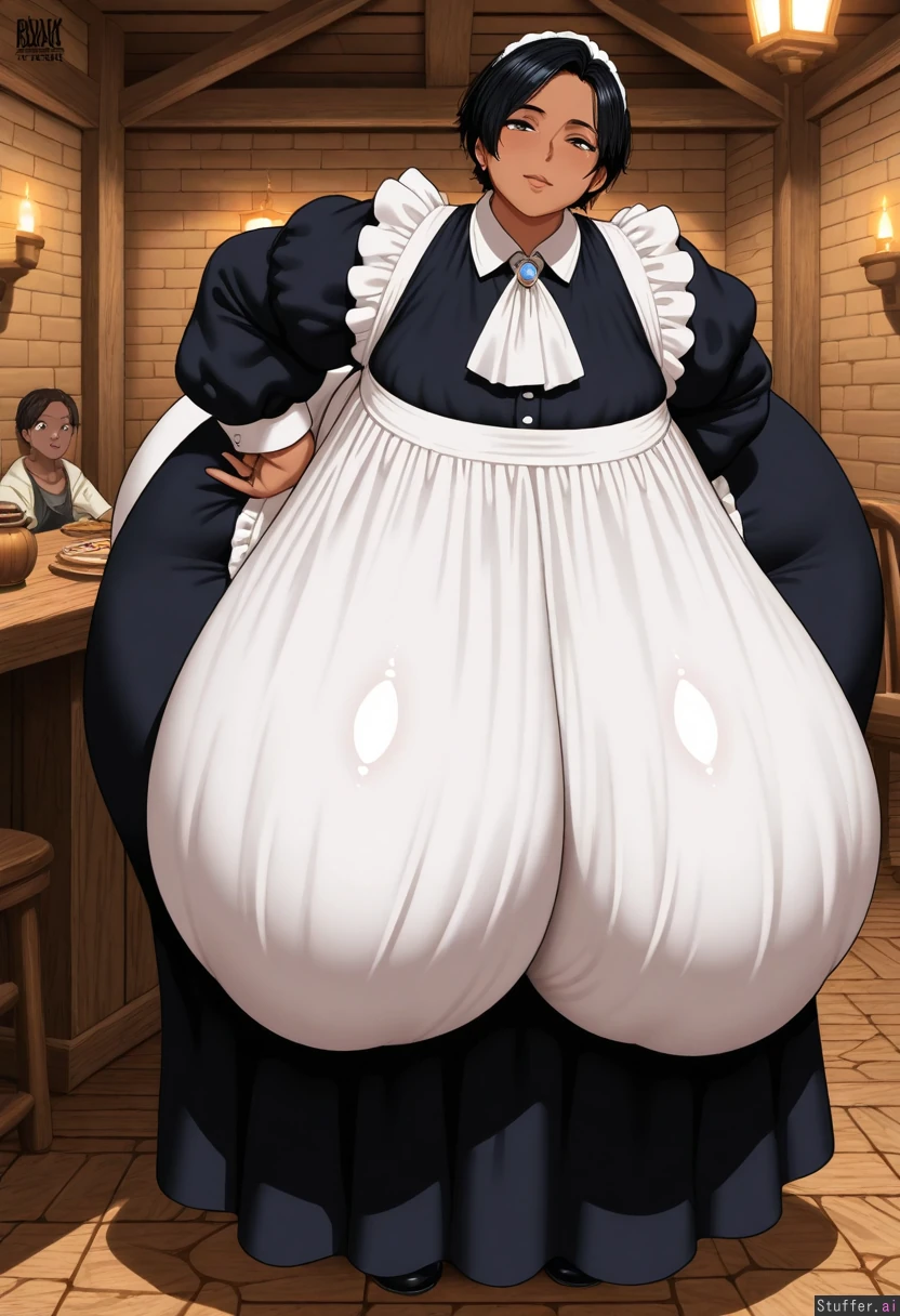 (Fellatrix) a ssbbw old milf, brown skin ,short black hair tomboy, (obese body:1.4), (Gigantic ass:1.4), (gigantic hips:1.4), (gigantic thighs:1.4), (gigantic breasts:1.8) (Sagging breasts:1.9), (gigantic belly:1.2), (Fully clothed:1.4), She wears maid's clothes , She is leaning forward over a table in a tavern, Detailed full eyes and defined face.