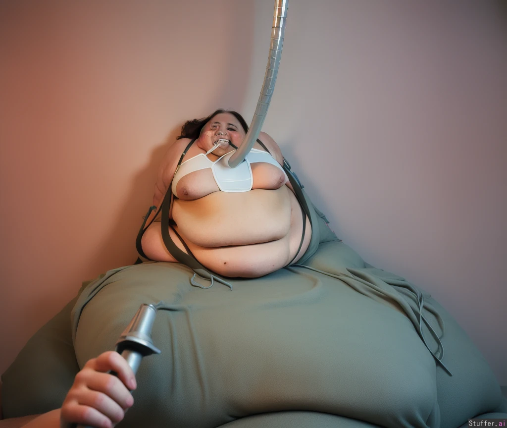 Photo realistic, ultra high quality, brunette ssbbw, beautiful face:1.4, heading leaning back, (ultra double chin:1.9), (ultra fat face:1.9), (ultra leg rolls:1.7), ultra huge legs:1.9), (ultra huge arms:1.9), (ultra leg rolls:1.7), (ultra huge arms:1.9), (ultra huge legs:1.9), (small breasts:1.4), wearing a white bra, sitting on a bed, funnel tube to mouth,