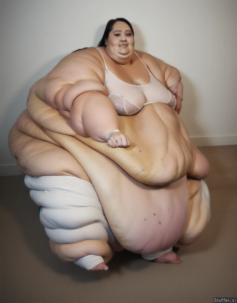 Photo realistic, ultra high quality, japanese ssbbw, beautiful face:1.4, (ultra double chin:1.9), (ultra fat face:1.9), (ultra leg rolls:1.7), ultra huge legs:1.9), (ultra huge arms:1.9), (ultra leg rolls:1.7), (ultra huge arms:1.9), (ultra huge legs:1.9), (small breasts:1.4), wearing a white bra,