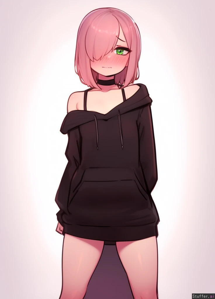 best quality, high rating, c.cu, betterwithsalt, ourobot, spellsx(artist), one woman, solo, cute face, pretty eyes, perfect eyes, clear eyes, perfect hands, perfect anatomy, light pink hair, medium hair, spiky hair, ((hair over left eye)), pale skin, green eyes, blushing, embarrassed, arms behind back, skinny, flatchest, narrow hips, small ass, ((oversized hoodie, hoodie as dress, black hoodie, simple clothes, visible bra straps, exposed left shoulder,)) black choker, bare thighs, loose clothes, wavy mouth, standing, neutral camera angle, from front, facing right, looking at viewer, white background, blank background, simple background, Visible from the knees to head, aroused, horny,