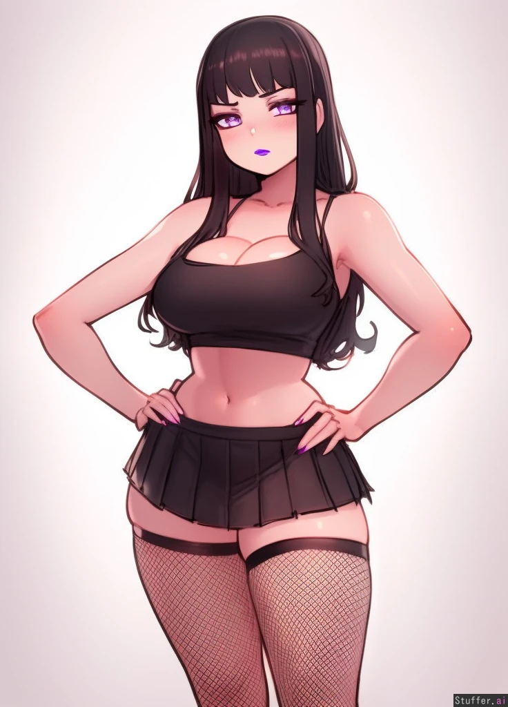 best quality, high rating, c.cu, betterwithsalt, ourobot, spellsx(artist), one woman, solo, pretty face, perfect hands, perfect anatomy, pretty eyes, perfect eyes, symmetrical face, lavender eyes, pale skin, black hair, long hair, medium breasts, slim build, medium ass, purple lipstick, black crop top, exposed midriff, cleavage, black pleated skirt, fishnet_stockings, visible from knees to head, blank background, white background, standing, frown, looking_at_viewer, hands on hips,