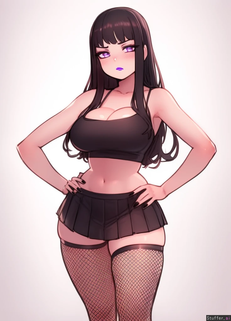 best quality, high rating, c.cu, betterwithsalt, ourobot, spellsx(artist), one woman, solo, pretty face, perfect hands, perfect anatomy, pretty eyes, perfect eyes, symmetrical face, lavender eyes, pale skin, black hair, long hair, medium breasts, slim build, medium ass, purple lipstick, black crop top, exposed midriff, cleavage, black pleated skirt, fishnet_stockings, black nails, visible from knees to head, blank background, white background, standing, frown, looking_at_viewer, hands on hips, relaxed pose,