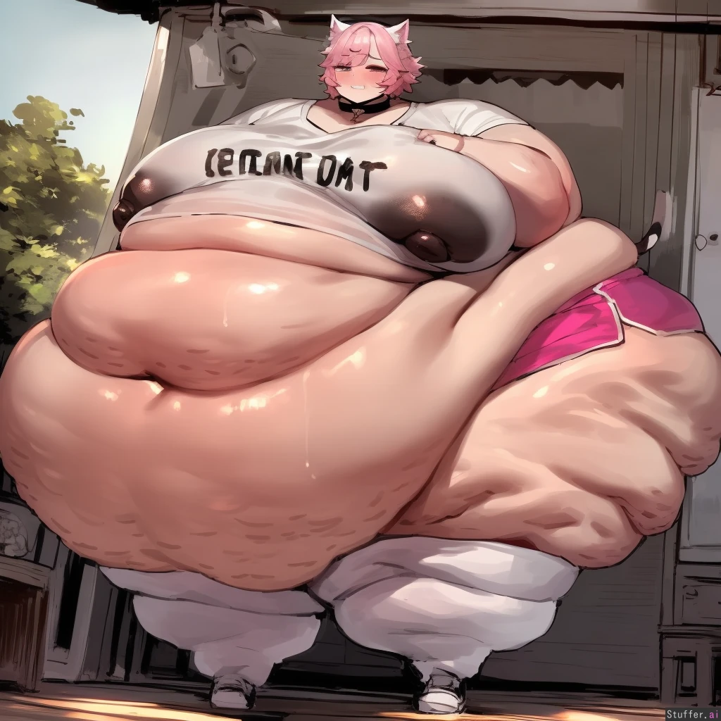 best quality, high rating, high detailed, 4k, accurate anatomy, correct anatomy, c.cu, day, bedroom, pretty face, fluffy body, ((hyper fat bhm student)),(((pink hair, boyish hair, pink booty shorts,fem, twink, submissive, choker, oversized white t-shirt))),1 catboy, twink, cat ears, cat tail, collar, hyper fat, fat chest, wide hips, hyper flabby arms, legs, hyper belly, hyper round belly, deep navel, huge hips, hyper ass, huge thighs, huge dark nipples, , seductive, horny, smiling, standing(thick thighs:1.2), ((disproportionately oversized giant plump legs:2))(chunky thighs:1.3), (huge bubble butt), white knee high socks, bigger thighs, (massive thighs), (hyper thighs:2.0), ((cellulite)) (fat rolls) ((hyper round bloated inflated body:1.5))((hyper morbidly obese male) ((feedee giant:1.5)) ( hyper round over inflated ball belly:2)) . Full body image, full shot image