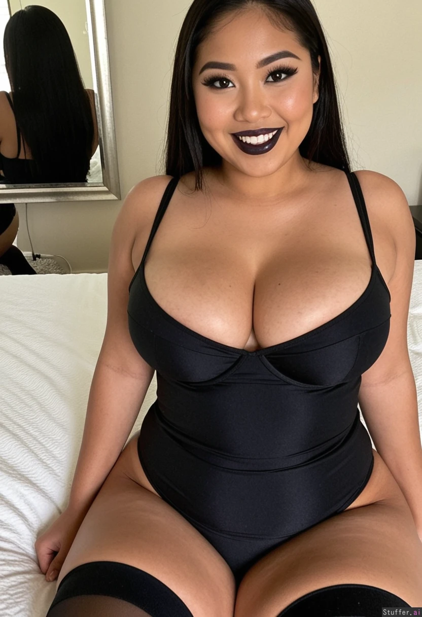 19 year old southeast asian girl. She has a very curvy body with wide hips and a fat ass. Her thighs are thick and voluptuous. She has a slight tummy with massive its. Shes has a skin tight black stripper dress that barely contains her curves displaying her massive cleavage. She has sharp facial features and thick luscious lips. She as a super happy grin. Her belly rolls are visible through the tight fabric of the dress. She has black lipstick and thick black eyeliner. She has narrow shoulders. She has a belly pudge. Shes sitting down