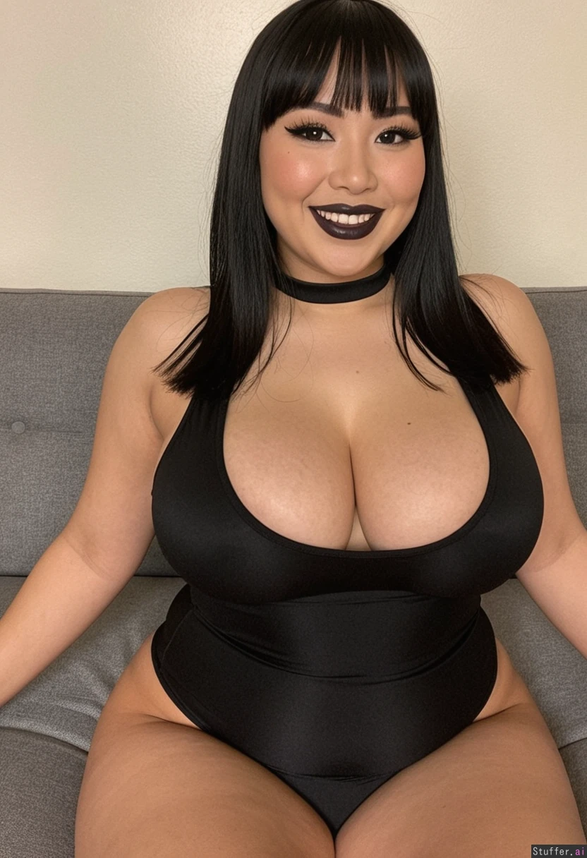 19 year old southeast asian girl. She has a very curvy body with wide hips and a fat ass. Her thighs are thick and voluptuous. She has a slight tummy with massive its. Shes has a skin tight black stripper dress that barely contains her curves displaying her massive cleavage. She has sharp facial features and thick luscious lips. She as a super happy grin. Her belly rolls are visible through the tight fabric of the dress. She has black lipstick and thick black eyeliner. She has narrow shoulders. She has a belly pudge. Shes sitting down. She has bangs