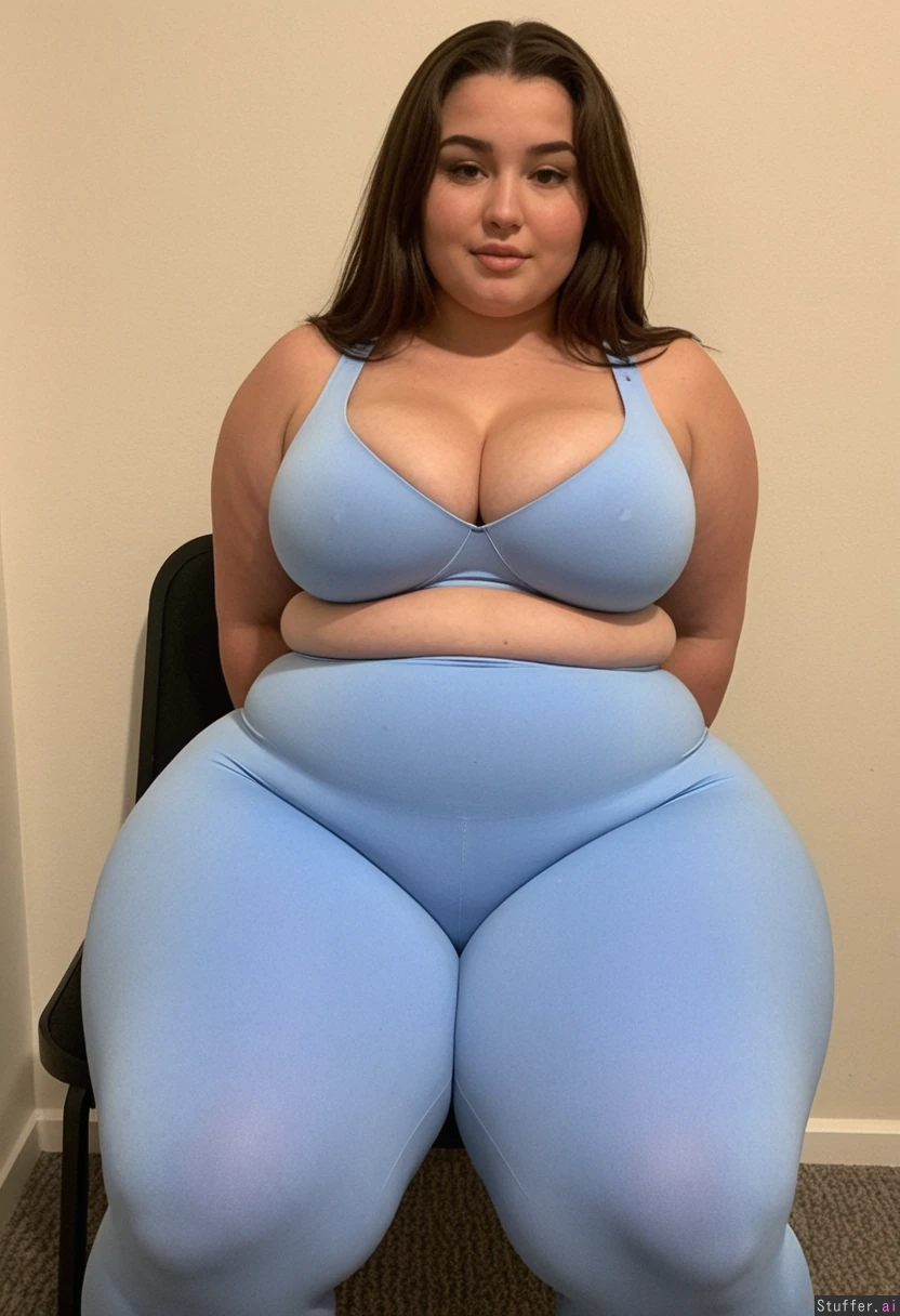 Curvy girl brown hair Sitting in chair wearing tight light blue leggings Light blue bra cleavage showing (slim face: 1.3) (pudgy waist: 1.0) (((Wide hips and thick thighs: 1.8))) (bigger fatter wider voluptuous hips: 1.2) (bigger fatter bulging voluptuous thighs: 1.5)