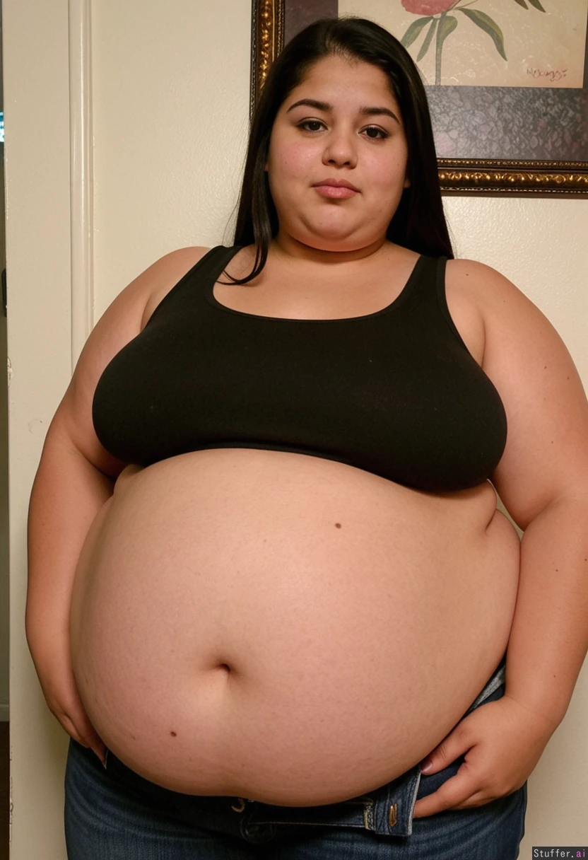 Fat Latina with black tank m top and jeans with thighs_bigger_than_head and big_belly huge arms and also a really chubby face