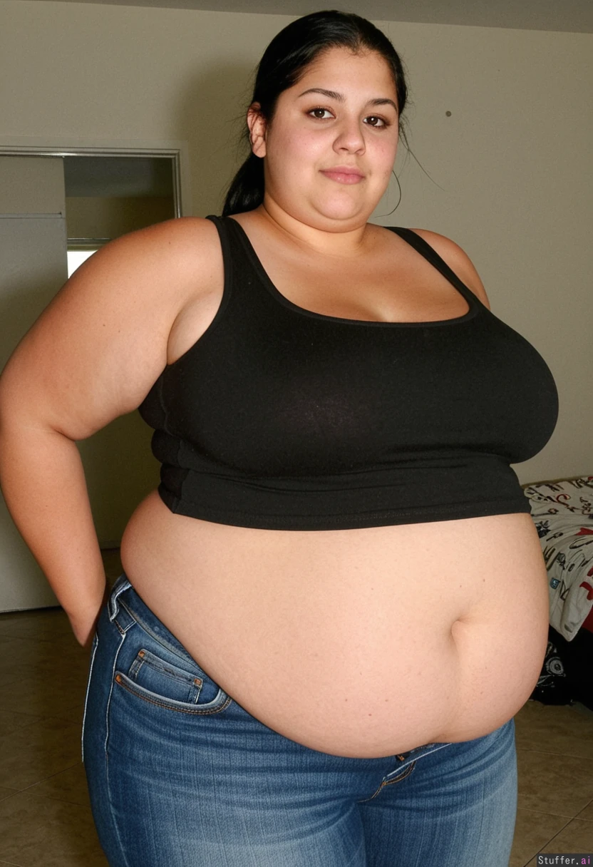 Fat Latina pretty with black tank m top and jeans with thighs_bigger_than_head and big_belly huge arms and also a really chubby face