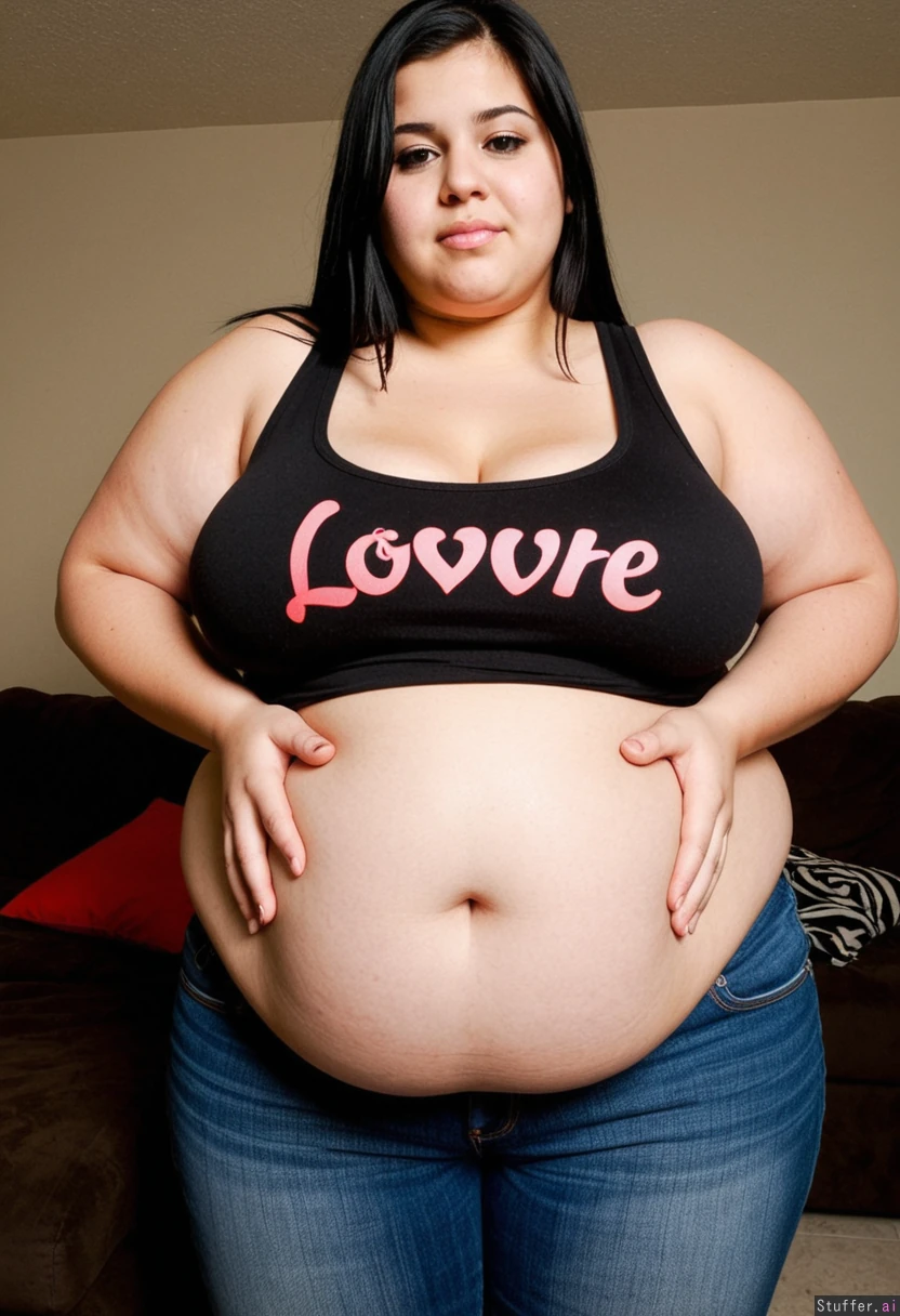 Fat Latina pretty with black tank m top and jeans with thighs_bigger_than_head and big_belly huge arms and also a really chubby face and huge love_handles slightly emo