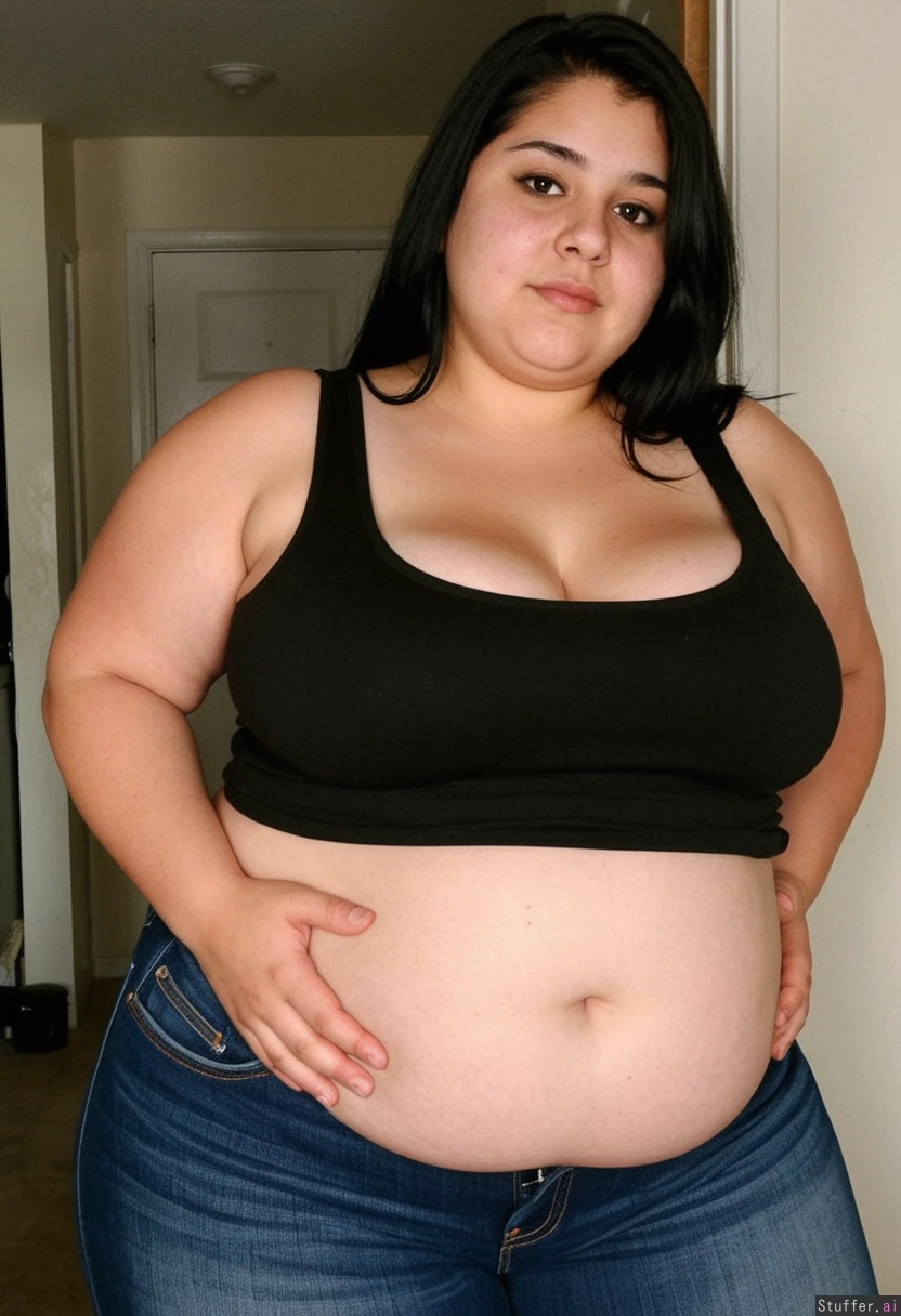 Fat Latina pretty with black tank m top and jeans with thighs_bigger_than_head and big_belly huge arms and also a really chubby face and huge love_handles slightly emo