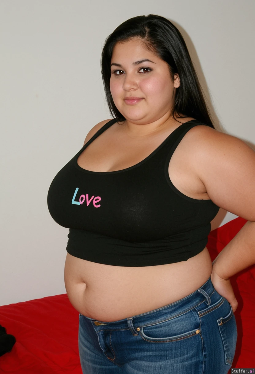 Very chubby Latina with a pretty face and a black tank top and jeans and love handles