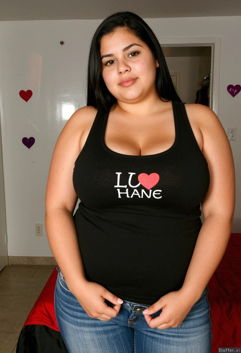 Very chubby Latina with a pretty face and a black tank top and jeans and love handles