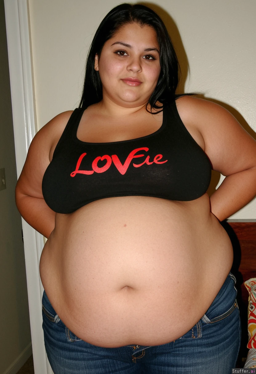 Very obese Latina with a pretty face and a black tank top and jeans and love handles