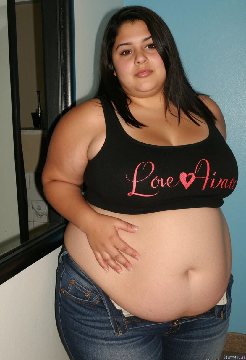 Very obese Latina with a pretty face and a black tank top and jeans and love handles