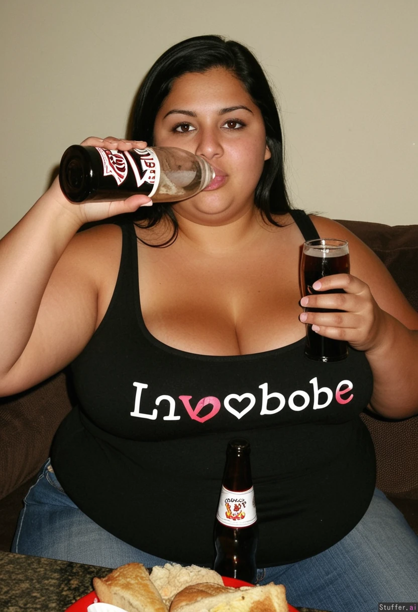 Very obese Latina with a pretty face and a black tank top and jeans and love handles drinking beer