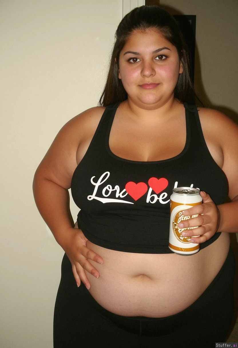 Very obese Latina with a pretty face and a black tank top and black leggings and love handles holding a beer