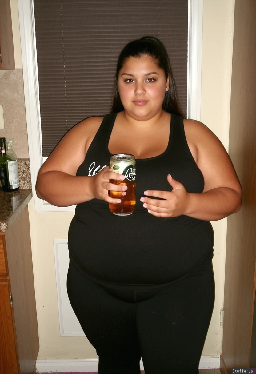 Very obese Latina with a pretty face and a black tank top and black leggings and love handles holding a beer