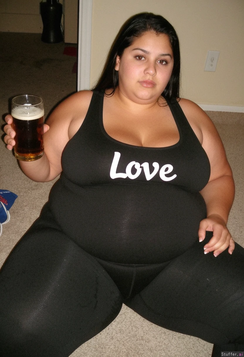Very obese Latina with a pretty face and a black tank top and black leggings huge thighs and love handles holding a beer while sitting down stomach resting on thighs