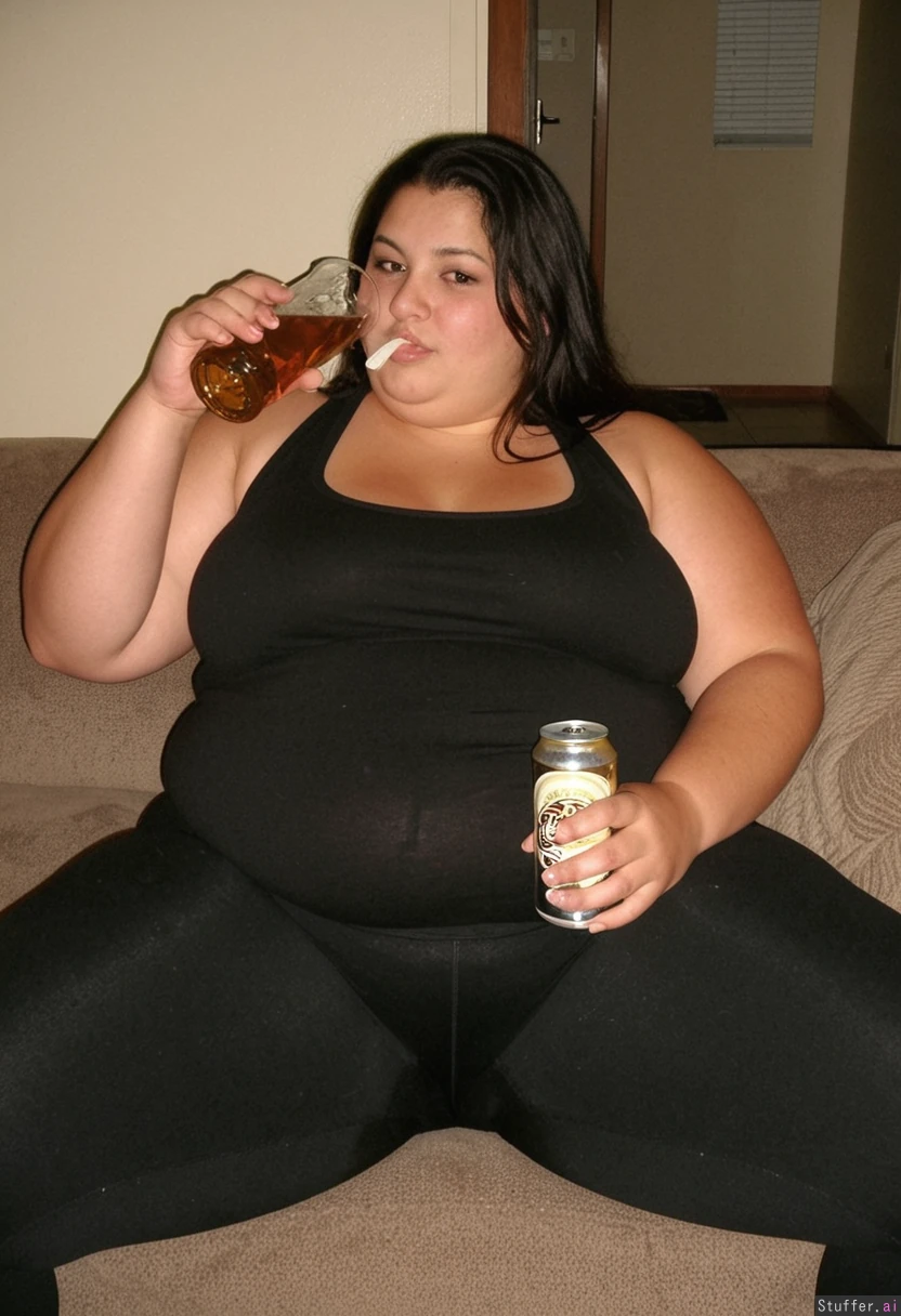 Very obese Latina with a pretty face and a black tank top and black leggings massive thighs and love handles holding a beer while sitting down stomach resting on thighs_bigger_than_head