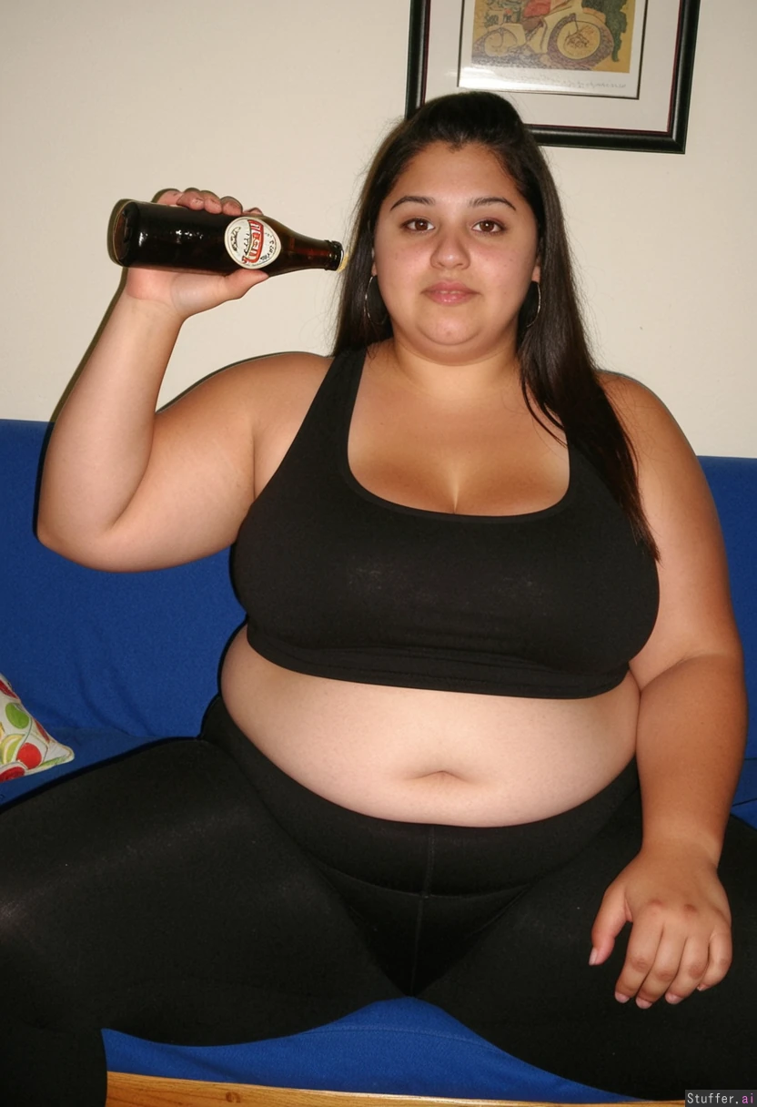 Very obese Latina with a pretty face and a black tank top and black leggings massive thighs and love handles holding a beer while sitting down stomach resting on thighs_bigger_than_head