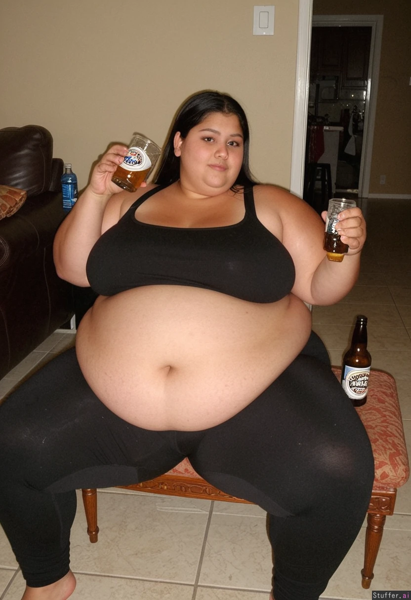Very obese Latina with a pretty face and a black tank top and black leggings massive thighs and love handles holding a beer while sitting down stomach resting on thighs_bigger_than_head
