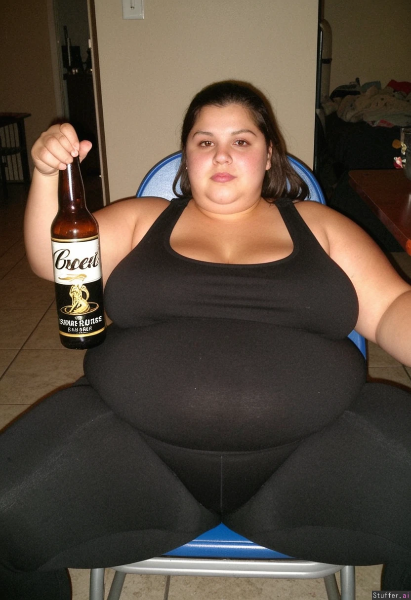 Very obese Latina with a pretty face and a black tank top and black leggings massive thighs and love handles holding a beer while sitting down stomach resting on thighs_bigger_than_head