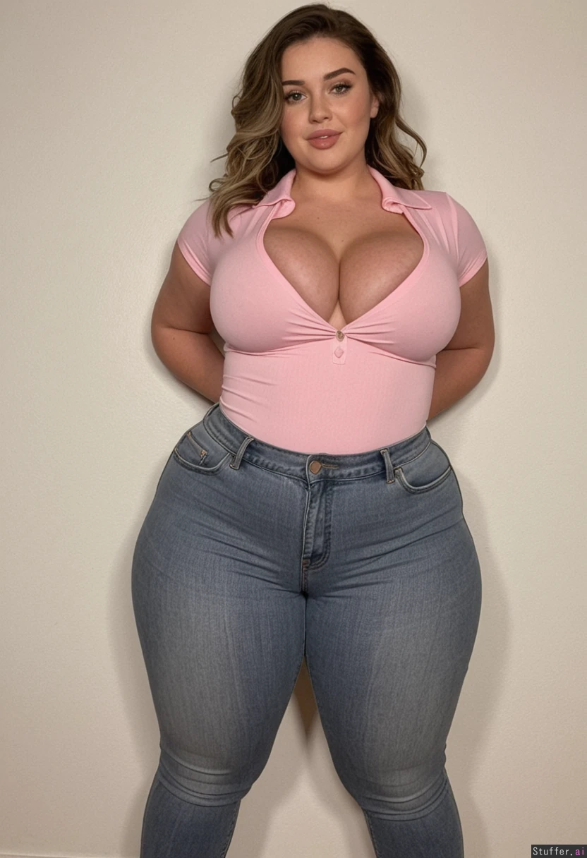 Irish supermodel, very youthful, 19 years old, ((front view)), standing, (beautiful busty influencer), eager playful flirty expression, ( middle parted tousled hair), layered_clothing((light pink polo collared one_piece_swimsuit, cleavage)), ((gray high jeans))), ((ultra wide hips and slim waist:1.5)), ((thick thighs and huge tits:1.3)), exposed waist, skin_exposed_waist, extremely detailed ,make her belly fatter